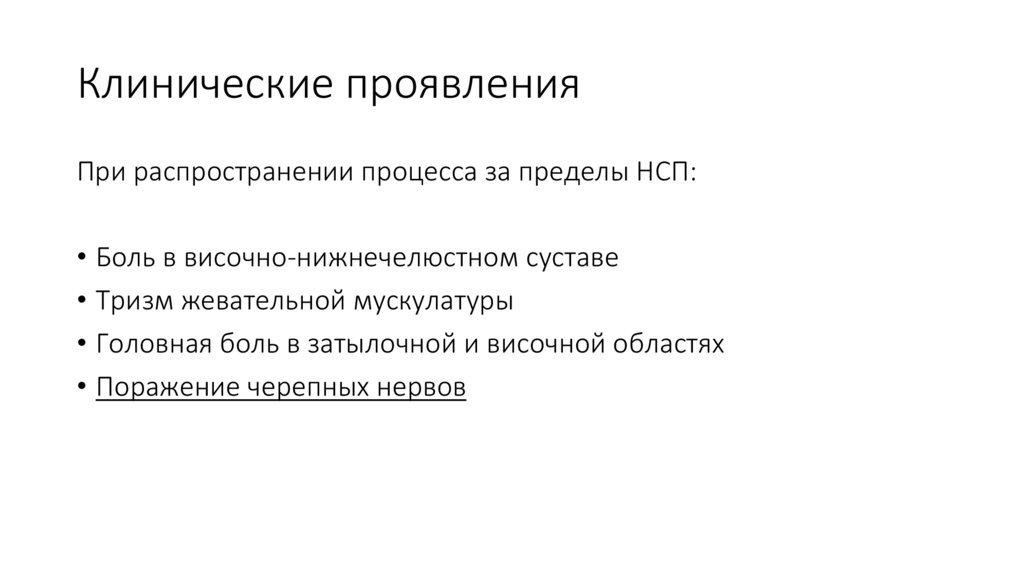 Клинические проявленияПри распространении процесса за пределы НСП: