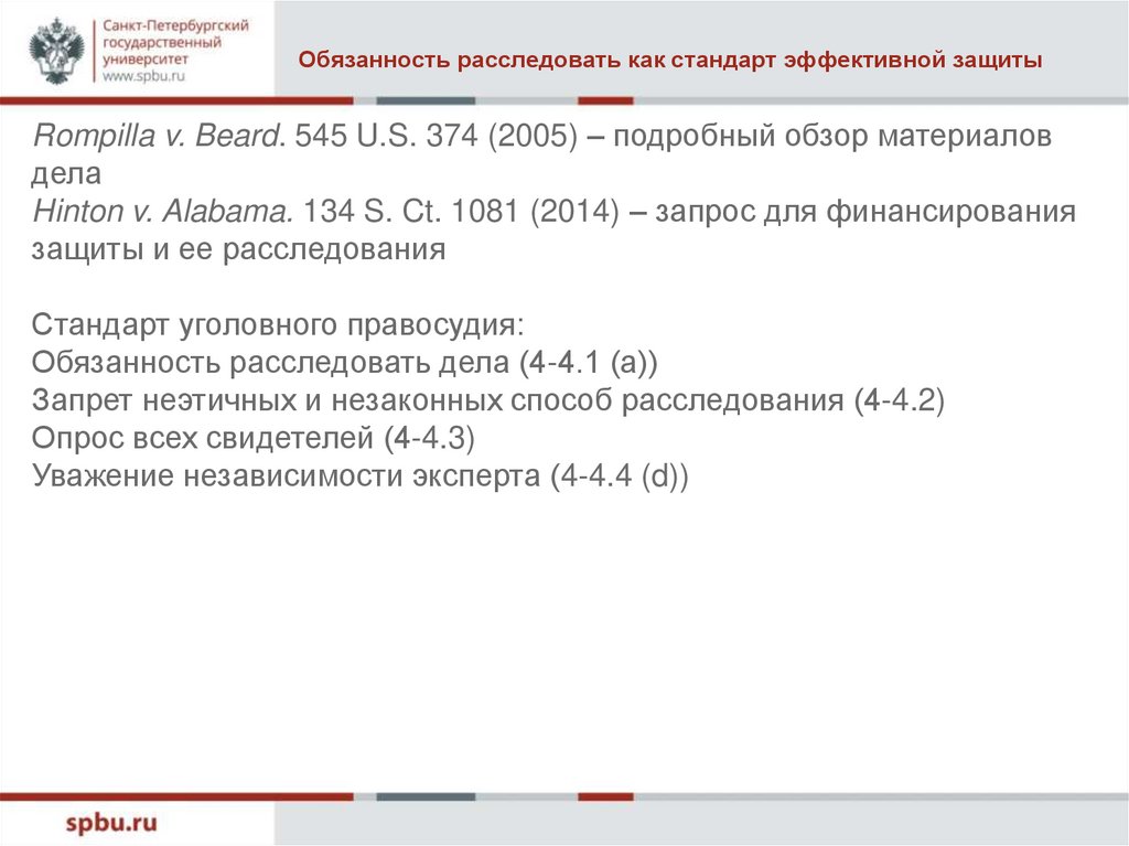 Обязанность расследовать как стандарт эффективной защитыRompilla v. Beard. 545 U.S. 374 (2005) – подробный обзор материалов