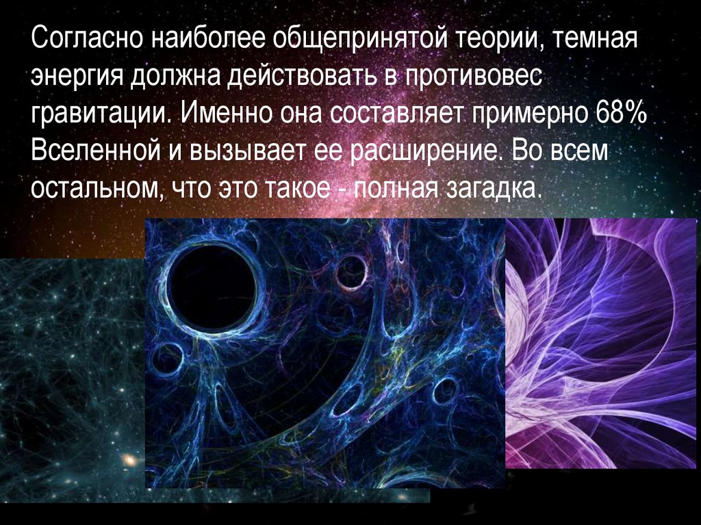 Согласно наиболее общепринятой теории, темнаяэнергия должна действовать в противовес