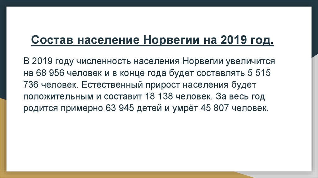 Состав население Норвегии на 2019 год.В 2019 году численность населения Норвегии увеличится