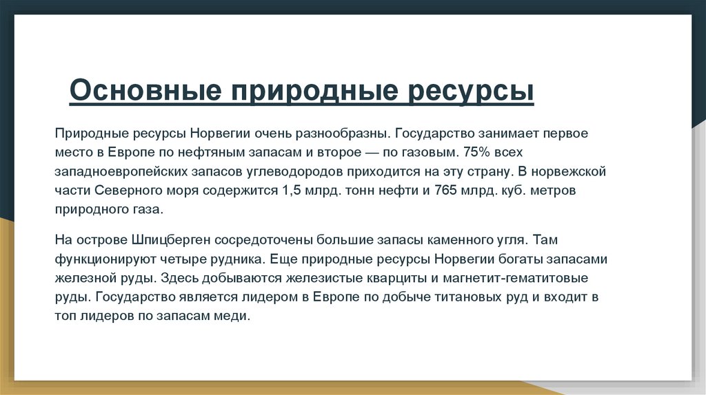 Основные природные ресурсыПриродные ресурсы Норвегии очень разнообразны. Государство занимает первое