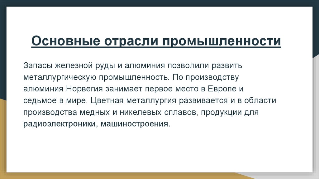 Основные отрасли промышленностиЗапасы железной руды и алюминия позволили развить