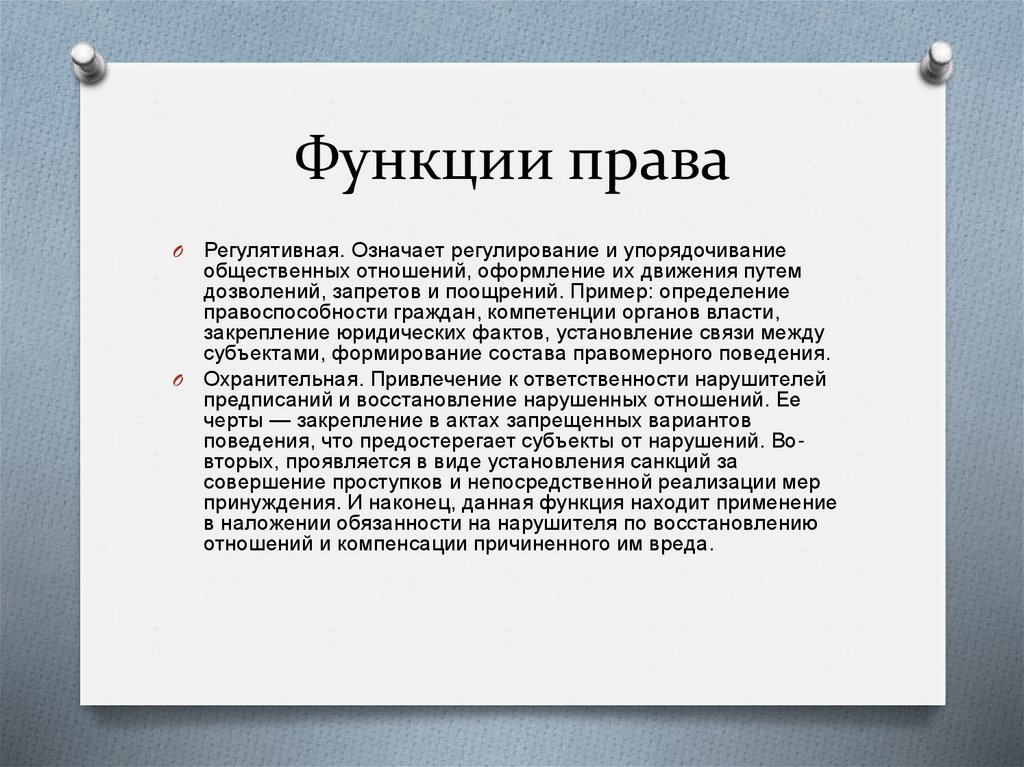 Функции праваРегулятивная. Означает регулирование и упорядочивание