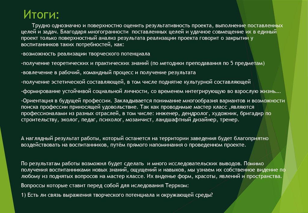 Итоги:Трудно однозначно и поверхностно оценить результативность проекта, выполнение поставленных