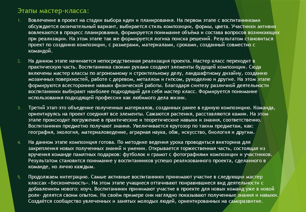 включены мастер классы по агрономному и строительному делу, ландшафтному дизайну, созданию