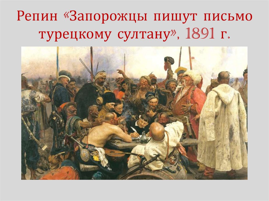 Репин «Запорожцы пишут письмотурецкому султану», 1891 г.