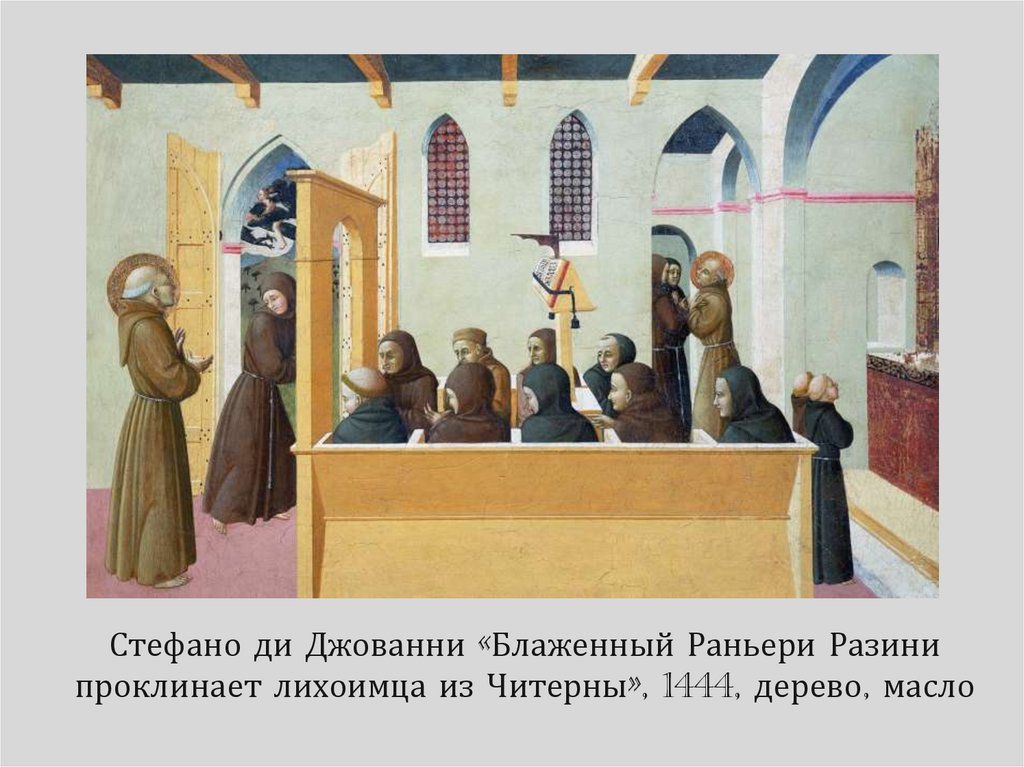 Стефано ди Джованни «Блаженный Раньери Разинипроклинает лихоимца из Читерны», 1444, дерево, масло