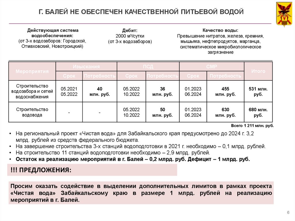 • Остаток на реализацию мероприятий в г. Балей – 0,2 млрд. руб. Дефицит – 1 млрд. руб.