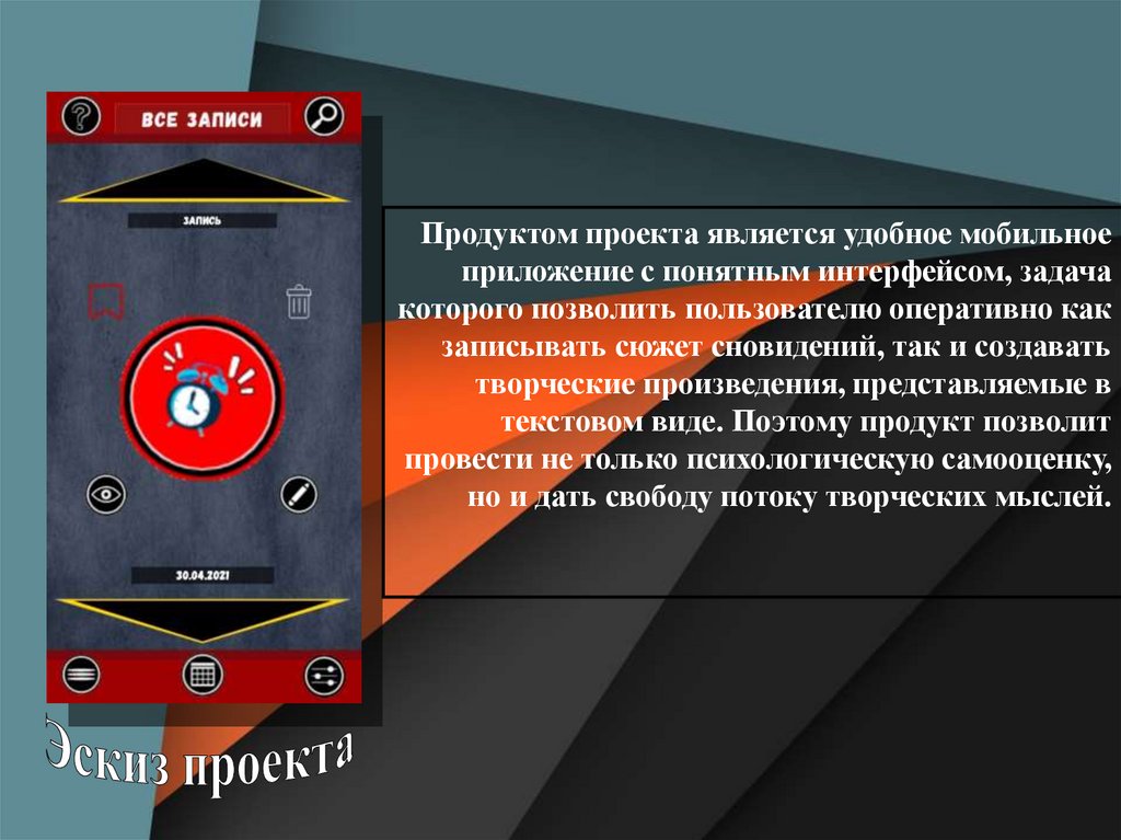 Продуктом проекта является удобное мобильноеприложение с понятным интерфейсом, задача