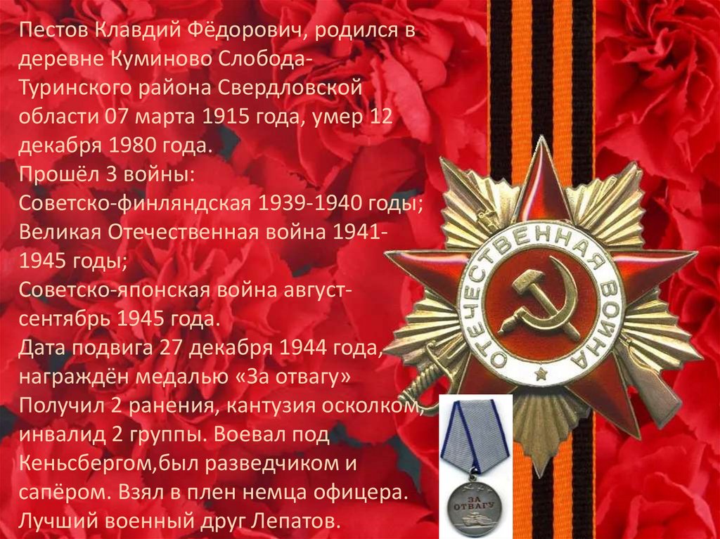 Пестов Клавдий Фёдорович, родился вдеревне Куминово СлободаТуринского района Свердловской