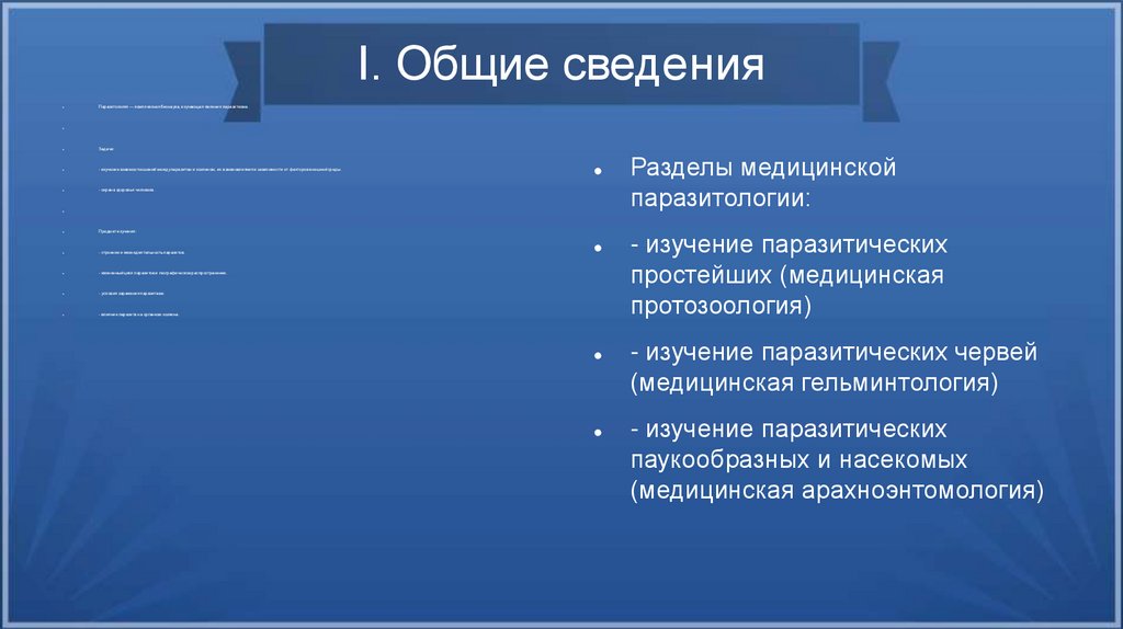 I. Общие сведенияПаразитология — комплексная бионаука, изучающая явления паразитизма.