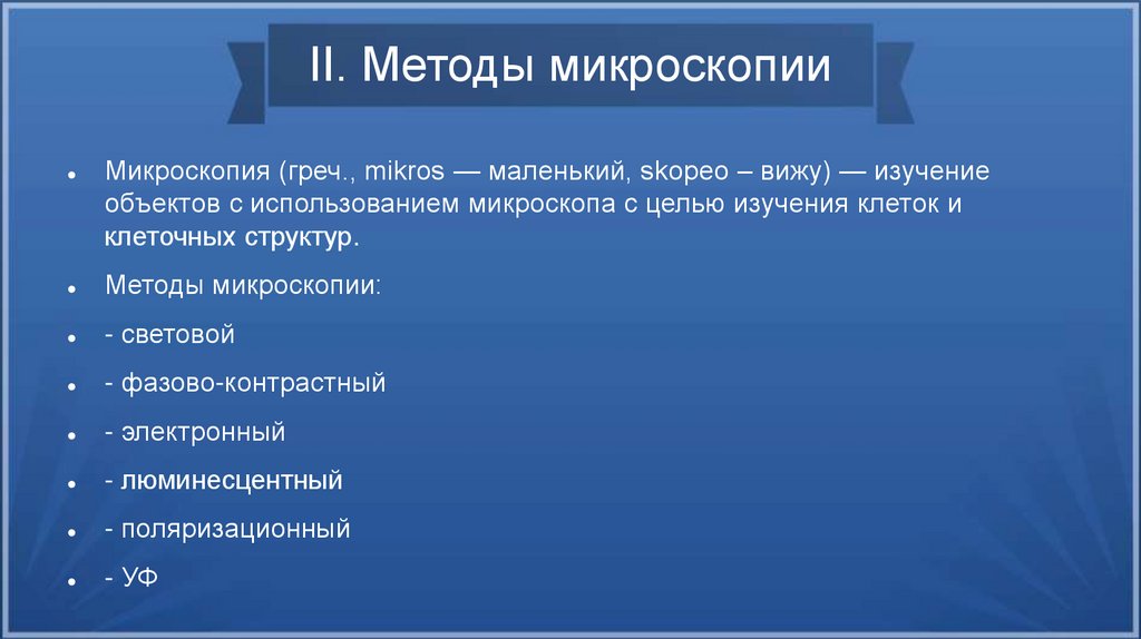 II. Методы микроскопииМикроскопия (греч., mikros — маленький, skopeo – вижу) — изучение