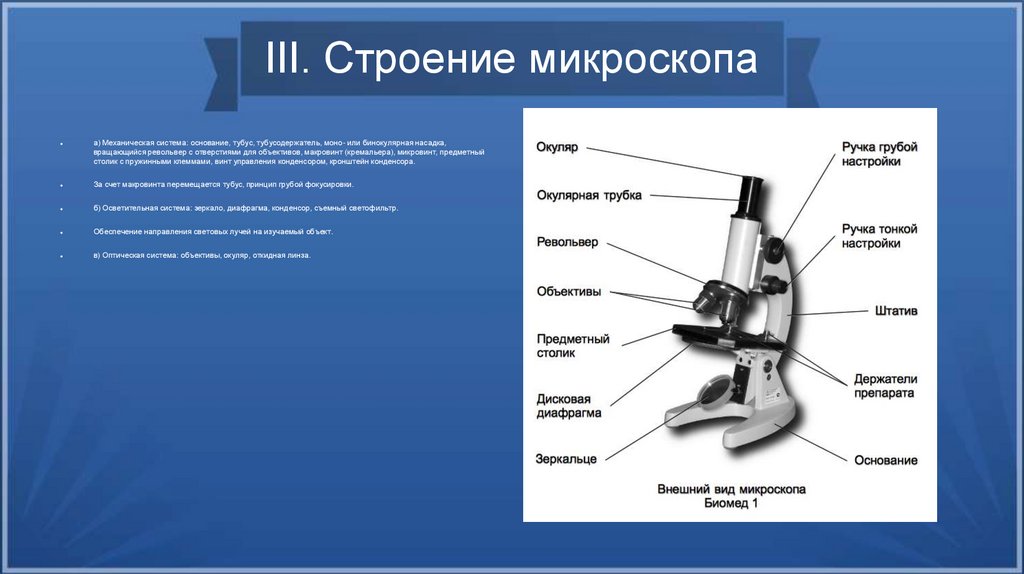III. Строение микроскопаа) Механическая система: основание, тубус, тубусодержатель, моно- или бинокулярная насадка,