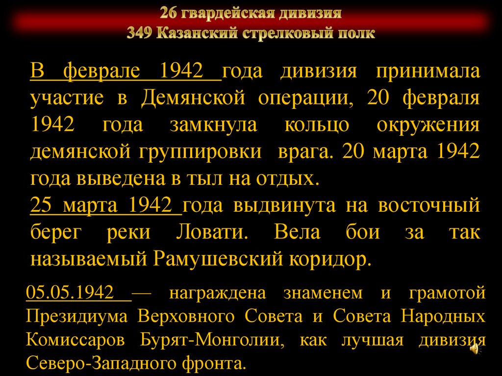 В феврале 1942 года дивизия принималаучастие в Демянской операции, 20 февраля