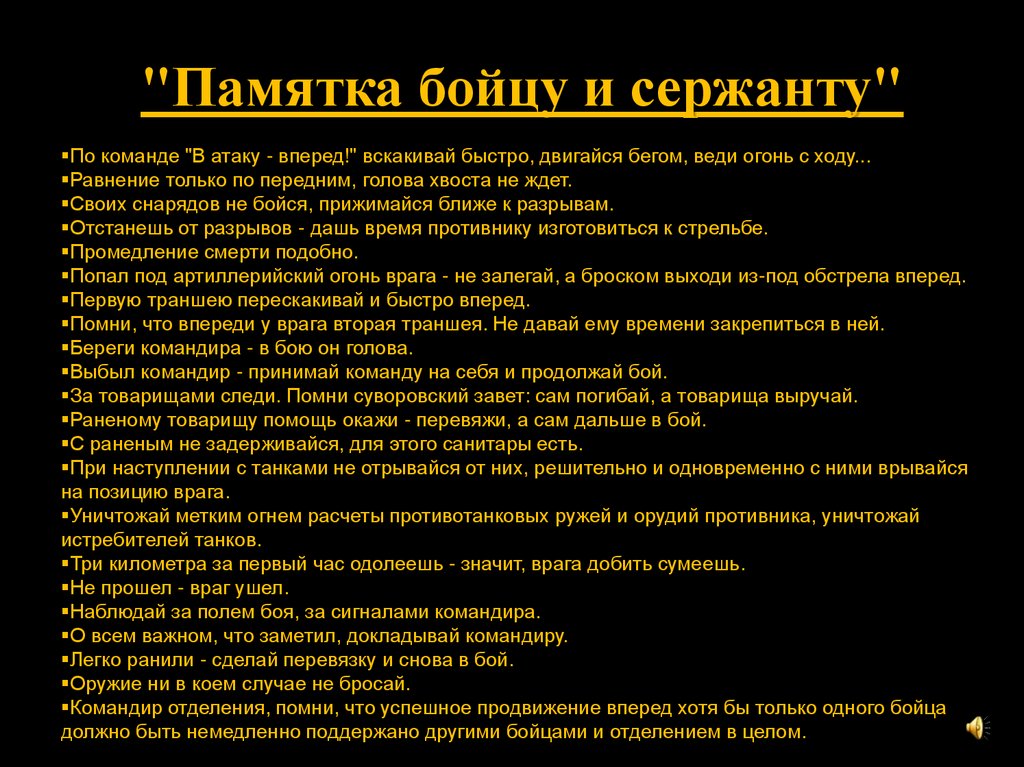 "Памятка бойцу и сержанту"По команде "В атаку - вперед!" вскакивай быстро, двигайся бегом, веди огонь с ходу...