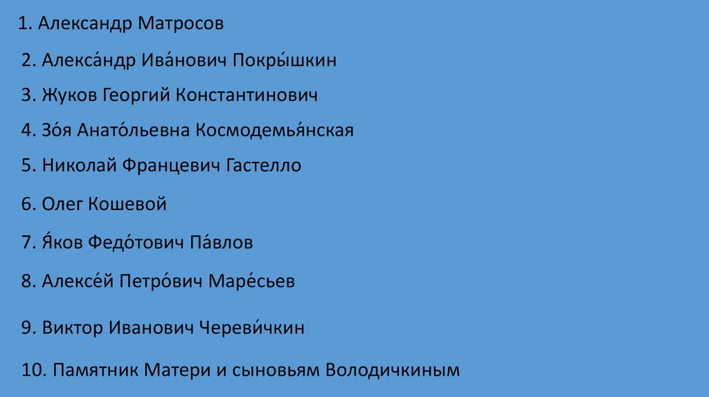1. Александр Матросов2. Алекса́ндр Ива́нович Покры́ шкин