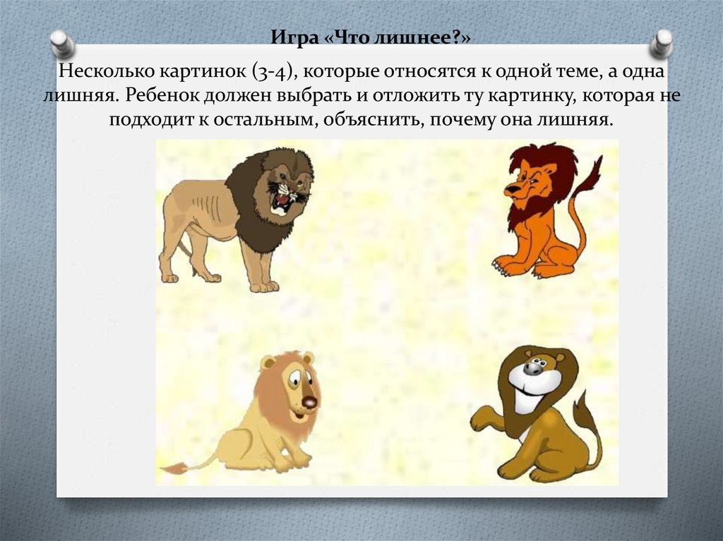 Игра «Что лишнее?»Несколько картинок (3-4), которые относятся к одной теме, а одна