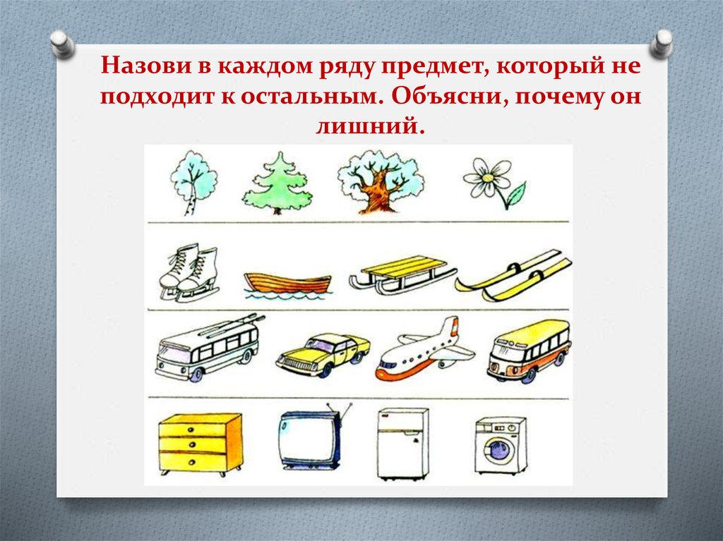 Назови в каждом ряду предмет, который неподходит к остальным. Объясни, почему он