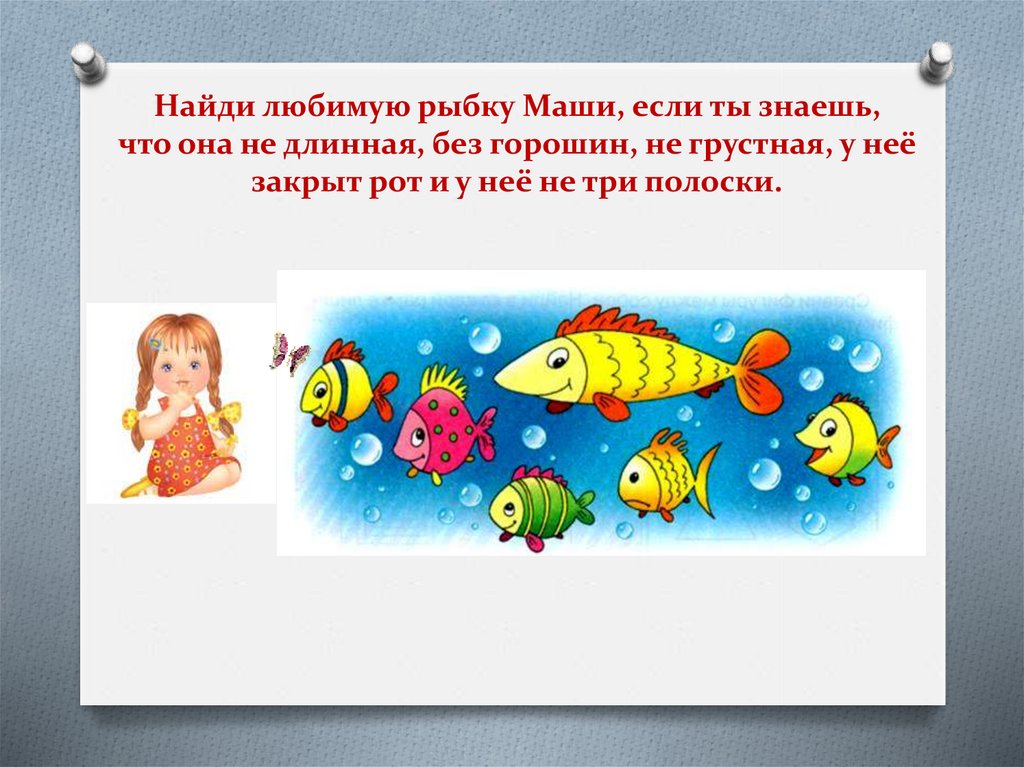Найди любимую рыбку Маши, если ты знаешь,что она не длинная, без горошин, не грустная, у неё