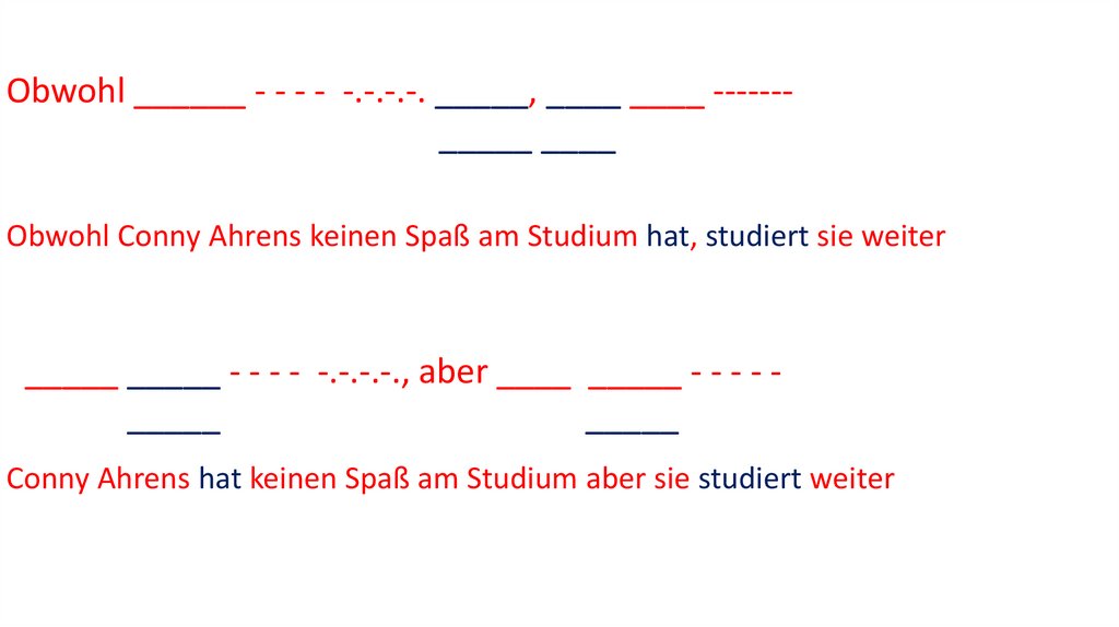 Obwohl ______ - - - - -.-.-.-. _____, ____ ____ ------_____ ____Obwohl Conny Ahrens keinen Spaß am Studium hat, studiert sie weiter