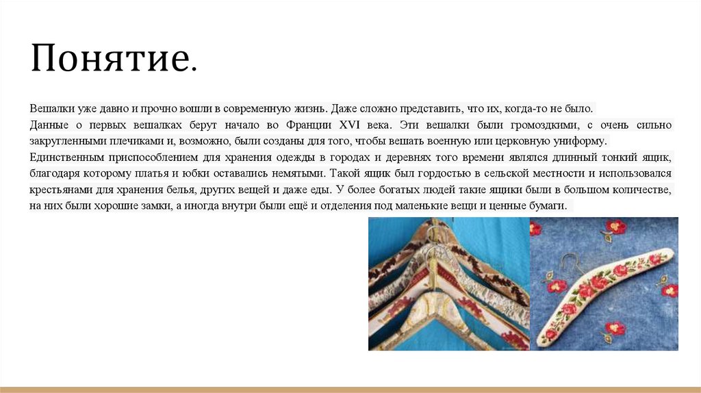 Понятие.Вешалки уже давно и прочно вошли в современную жизнь. Даже сложно представить, что их, когда-то не было.