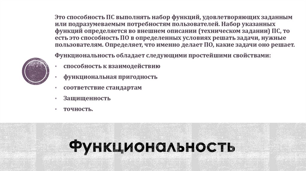 Это способность ПС выполнять набор функций, удовлетворяющих заданнымили подразумеваемым потребностям пользователей. Набор указанных