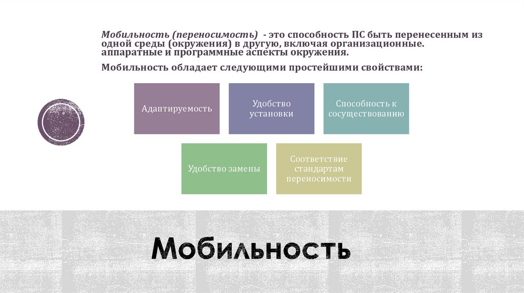 Мобильность (переносимость) - это способность ПС быть перенесенным изодной среды (окружения) в другую, включая организационные.
