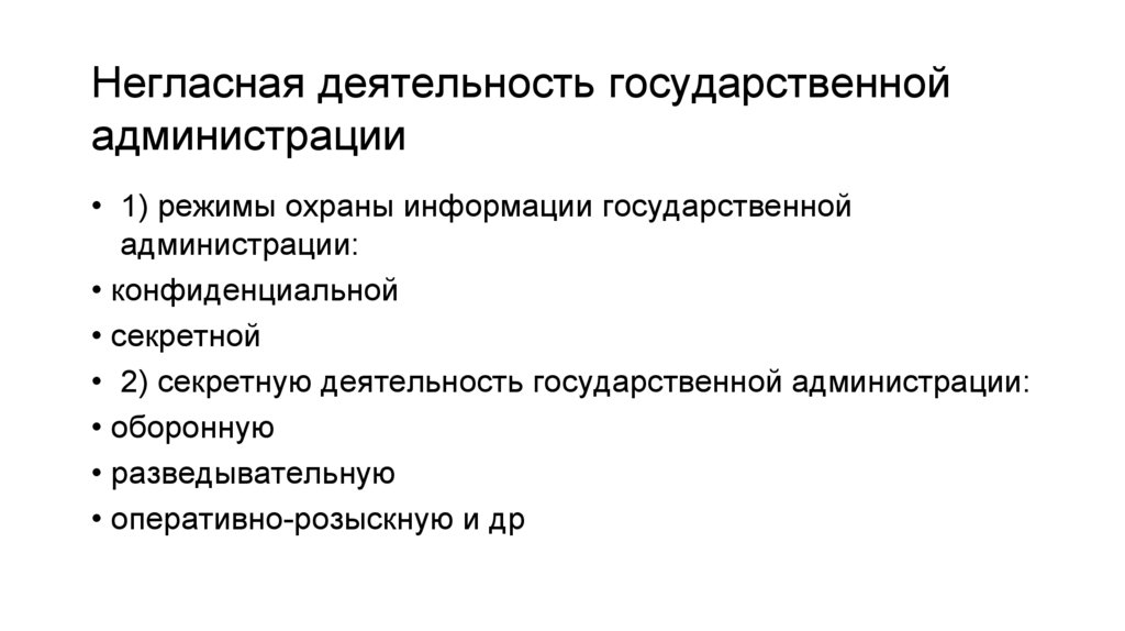 • 2) секретную деятельность государственной администрации:
