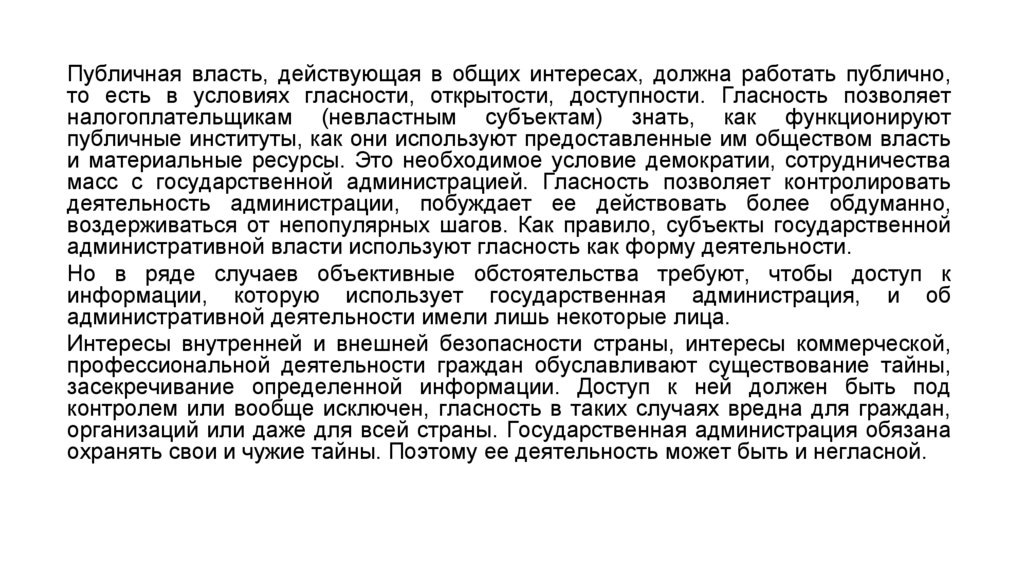 Публичная власть, действующая в общих интересах, должна работать публично,то есть в условиях гласности, открытости, доступности. Гласность позволяет