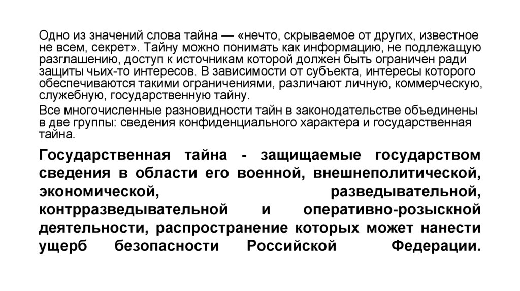 Одно из значений слова тайна — «нечто, скрываемое от других, известноене всем, секрет». Тайну можно понимать как информацию, не подлежащую