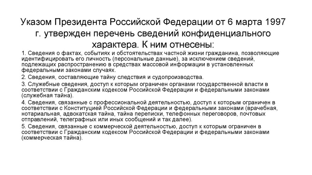 Указом Президента Российской Федерации от 6 марта 1997г. утвержден перечень сведений конфиденциального