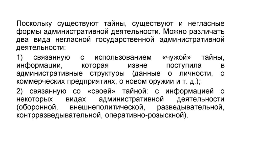 Поскольку существуют тайны, существуют и негласныеформы административной деятельности. Можно различать