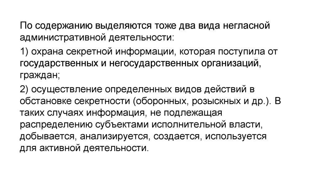 По содержанию выделяются тоже два вида негласнойадминистративной деятельности: