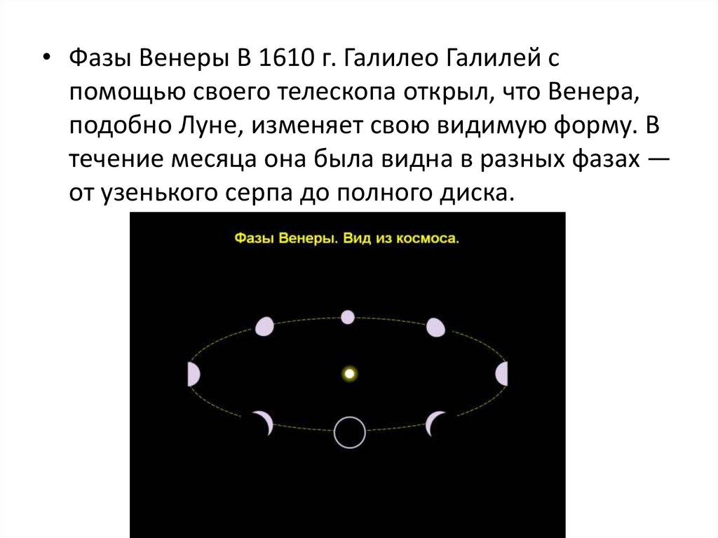 • Фазы Венеры В 1610 г. Галилео Галилей спомощью своего телескопа открыл, что Венера,