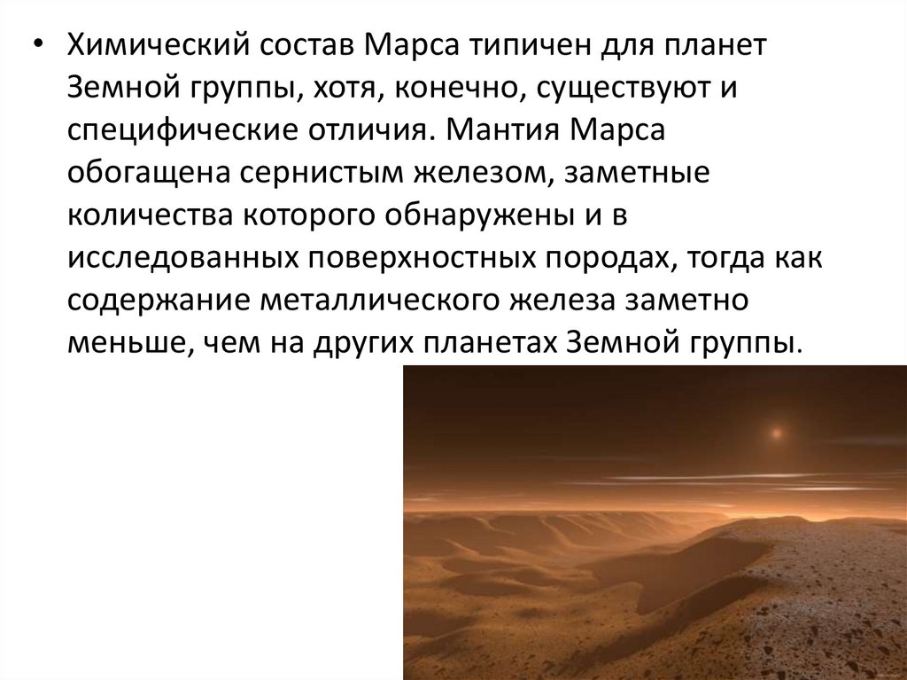 • Химический состав Марса типичен для планетЗемной группы, хотя, конечно, существуют и