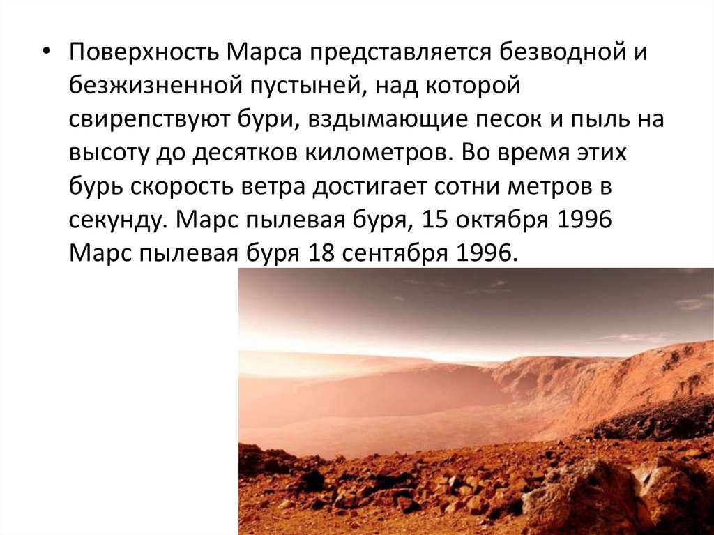 • Поверхность Марса представляется безводной ибезжизненной пустыней, над которой