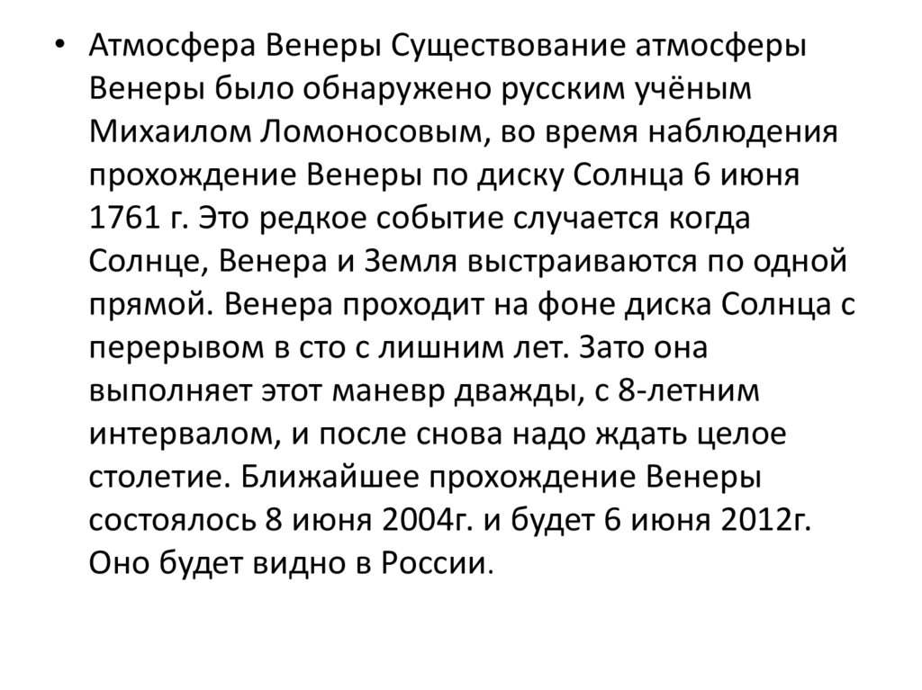 • Атмосфера Венеры Существование атмосферыВенеры было обнаружено русским учёным