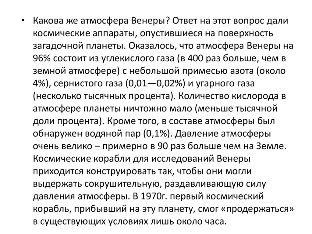 • Какова же атмосфера Венеры? Ответ на этот вопрос даликосмические аппараты, опустившиеся на поверхность