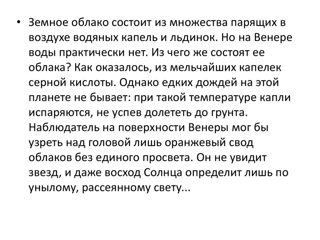 • Земное облако состоит из множества парящих ввоздухе водяных капель и льдинок. Но на Венере