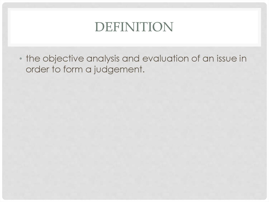DEFINITION• the objective analysis and evaluation of an issue in
