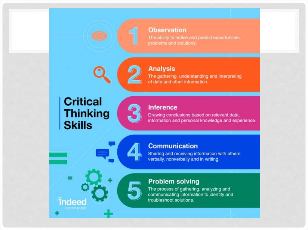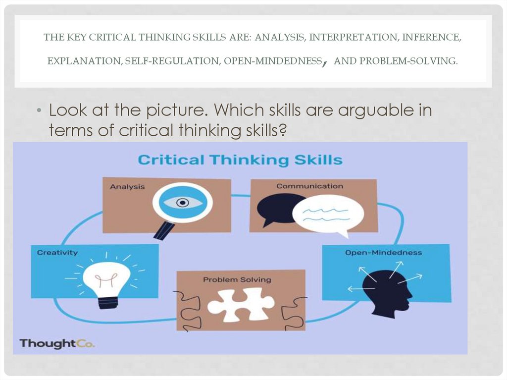 THE KEY CRITICAL THINKING SKILLS ARE: ANALYSIS, INTERPRETATION, INFERENCE,, AND PROBLEM-SOLVING.