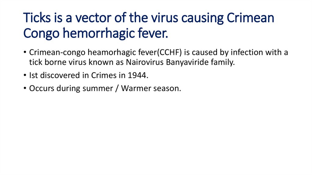 Ticks is a vector of the virus causing CrimeanCongo hemorrhagic fever.