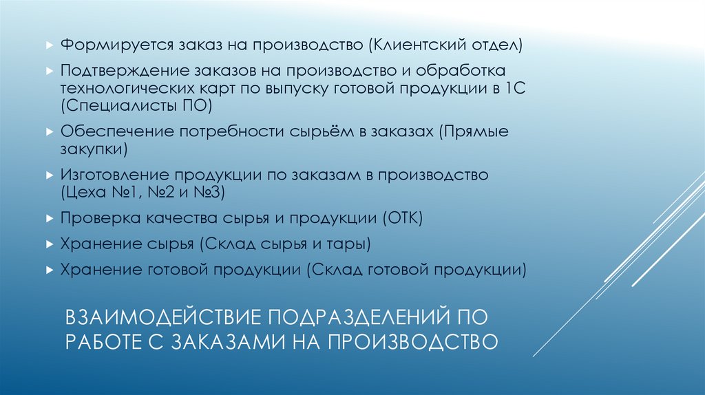 Формируется заказ на производство (Клиентский отдел)Подтверждение заказов на производство и обработка
