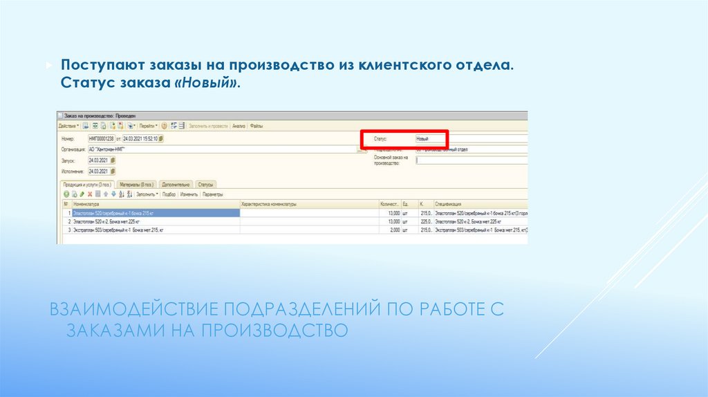 Поступают заказы на производство из клиентского отдела.Статус заказа «Новый».