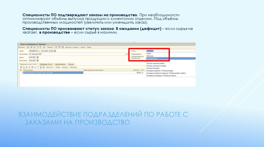 Специалисты ПО подтверждают заказы на производство. При необходимостиоптимизируют объёмы выпуска продукции с клиентским отделом. Под объёмы