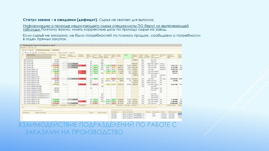 Статус заказа – в ожидании (дефицит). Сырья не хватает для выпуска.Информацию о приходе недостающего сырья специалисты ПО берут из «вытягивающей