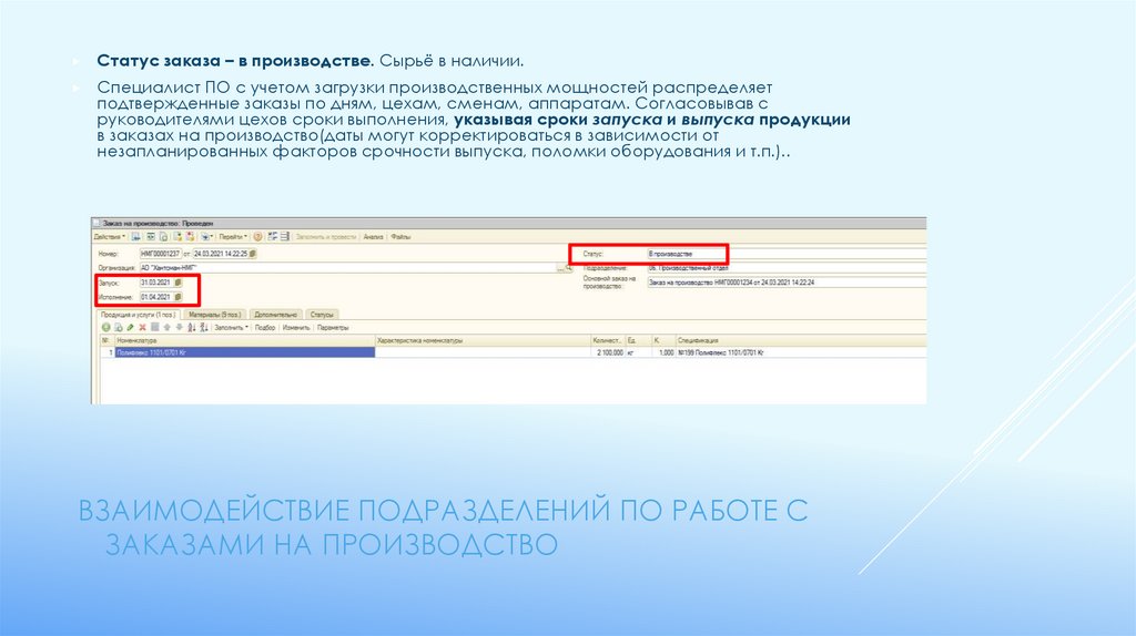 Статус заказа – в производстве. Сырьё в наличии.Специалист ПО с учетом загрузки производственных мощностей распределяет