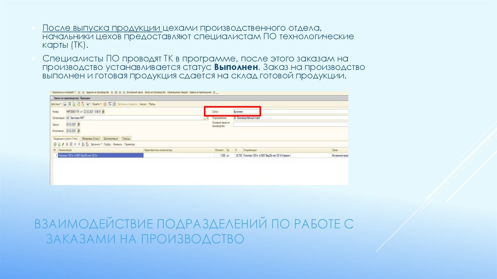 После выпуска продукции цехами производственного отдела,начальники цехов предоставляют специалистам ПО технологические