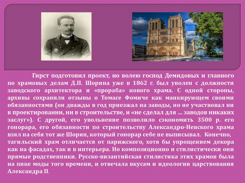 Гирст подготовил проект, но волею господ Демидовых и главногопо храмовых делам Д.П. Шорина уже в 1862 г. был уволен с должности