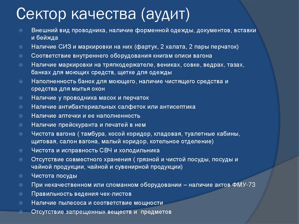 Сектор качества (аудит)Внешний вид проводника, наличие форменной одежды, документов, вставки